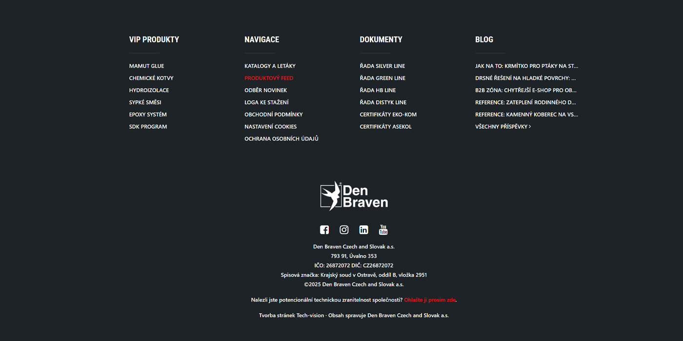 Produktový feed najdete v patičce našeho webu pod odkazem „Produktový feed“ nebo přímo na adrese: https://denbraven.cz/produktovy-feed/