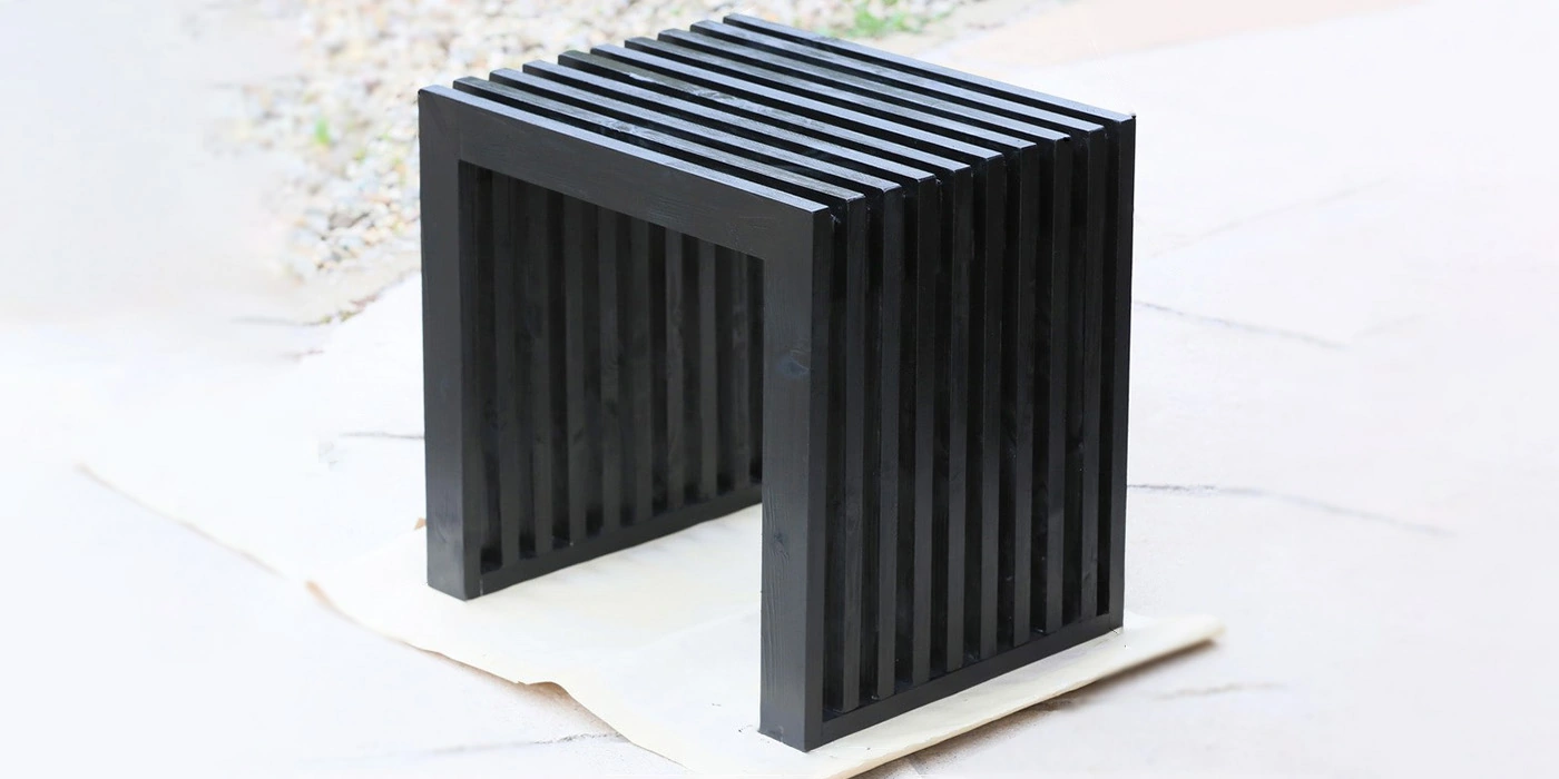 Po zaschnutí naneseme dvě vrstvy černé lazury. Přebytečný olej z druhé vrstvy po asi 5 minutách setřeme bavlněnou látkou, aby povrch zůstal matný a bez nežádoucího lesku.