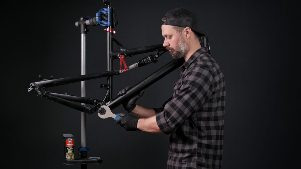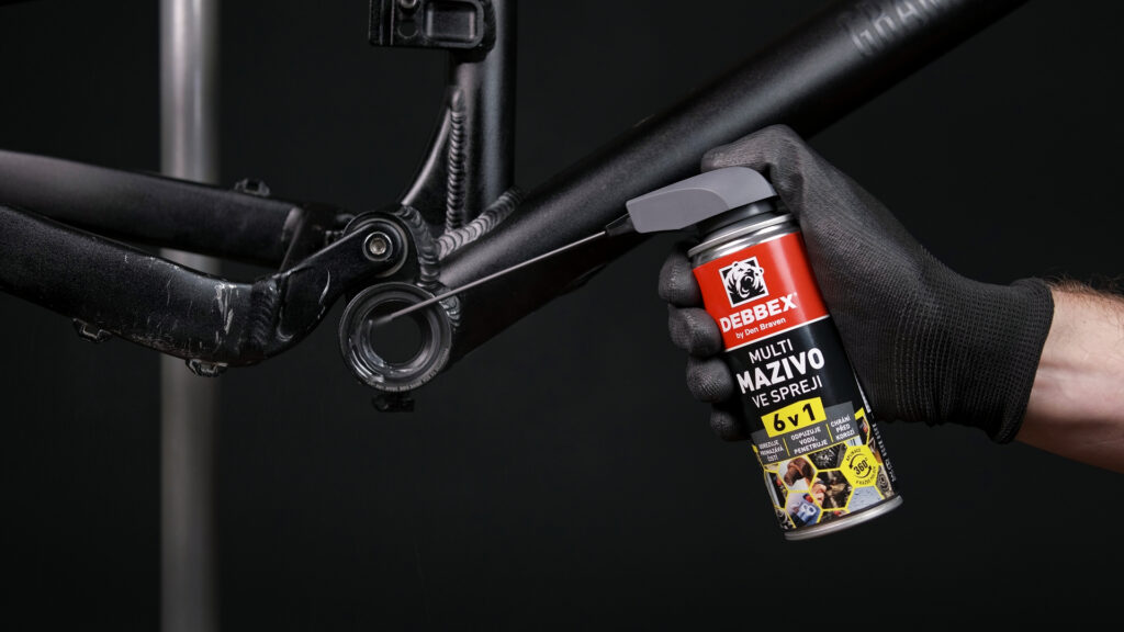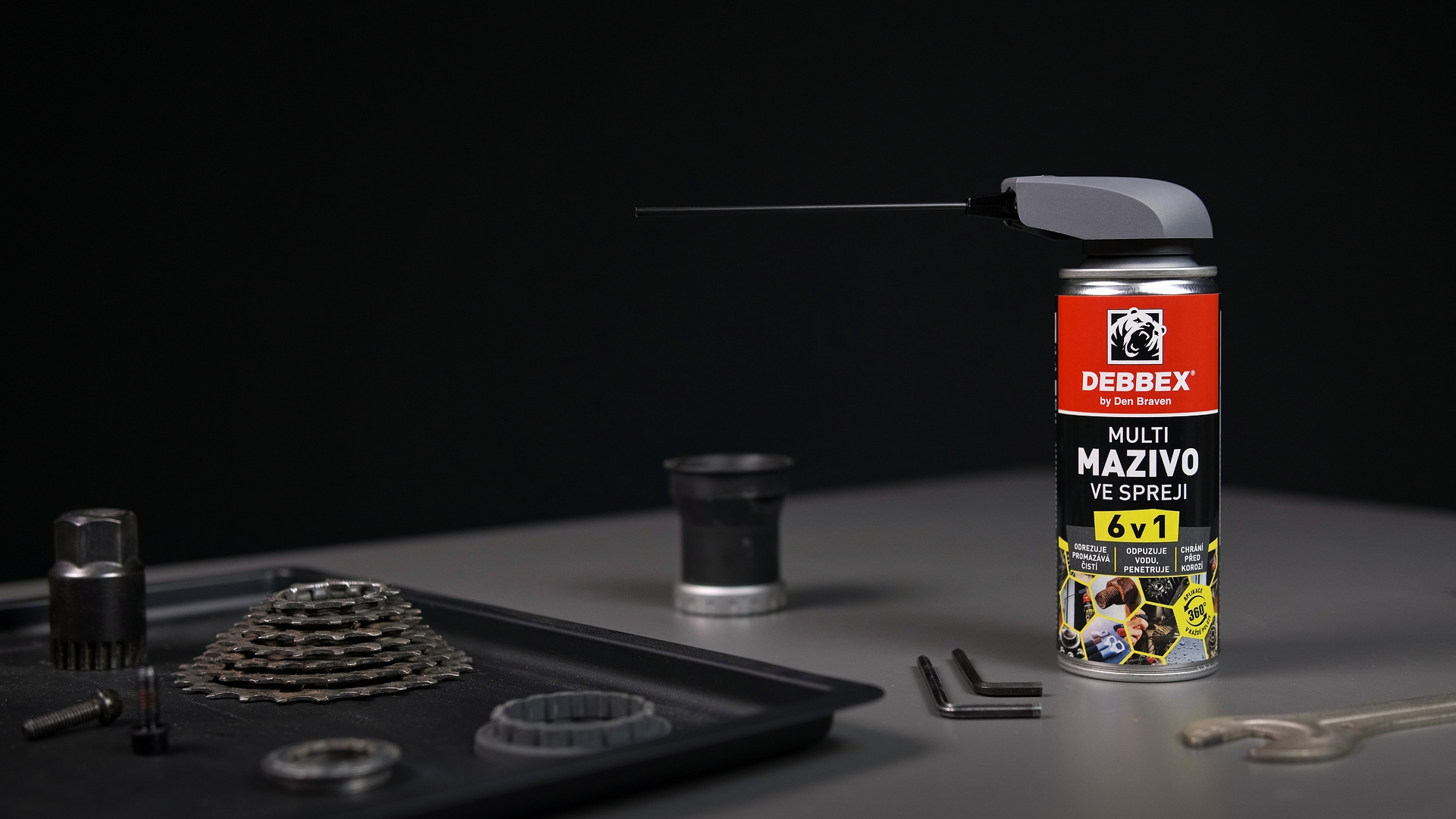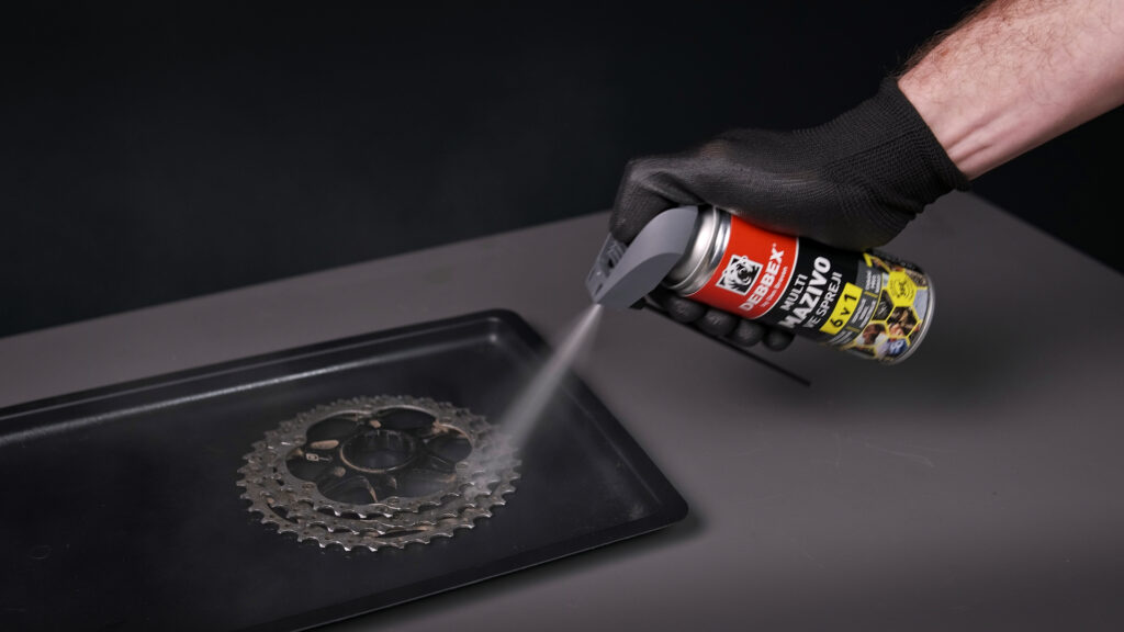 Každý olej nebo vazelína jednou přestanou plnit svou funkci a je potřeba je odstranit. Typický příklad je převodová kazeta horského kola zanesená směsí řetězového oleje, prachu a bláta. Trubičku sklopím a Multi Mazivo aplikuju širokým rozprašovačem. Sprej okamžitě rozpouští původní maziva, zároveň proniká do nýtovaných spojů, odkud vytlačuje vodu a vlhkost. Po zaschnutí vytvoří ochranný film.