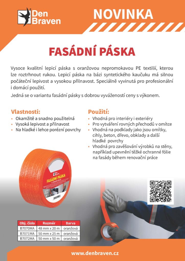 Vysoce kvalitní lepicí fasádní páska s oranžovou nepromokavou PE textilií, kterou lze roztrhnout rukou. Lepicí páska na bázi syntetického kaučuku má silnou počáteční lepivost, extrémně vysokou přilnavost. Speciálně vyvinutá pro profesionální i svépomocné použití.