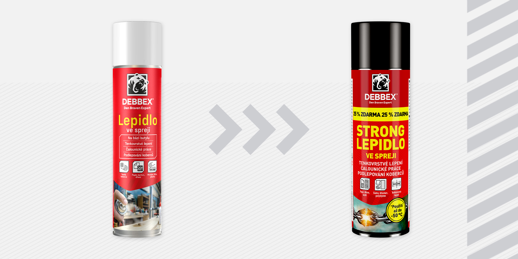 Představujeme nový design STRONG Lepidla ve spreji, který byl změněn s cílem zlepšit estetický dojem, ale také zvýšit uživatelskou přívětivost a kvalitu samotného výrobku. Navíc nyní nabízíme balení s 25 % obsahem navíc, což znamená 100 ml ZDARMA.