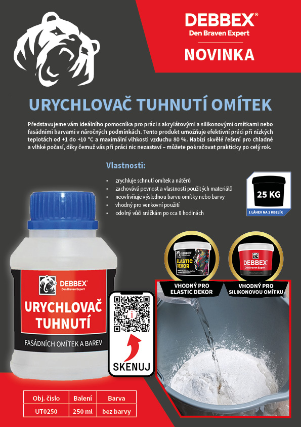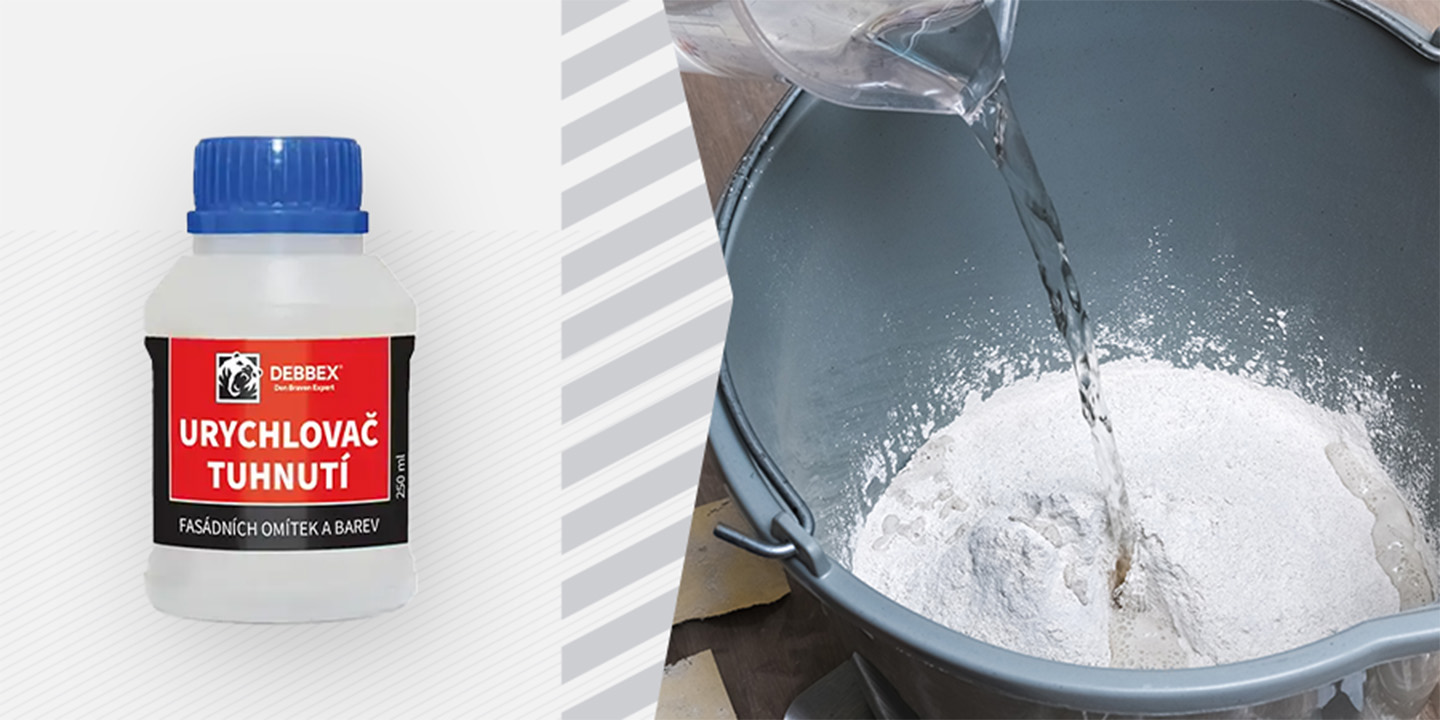 Urychlovač tuhnutí omítek pro zkrácení času schnutí akrylátových a silikonových omítek nebo fasádních barev