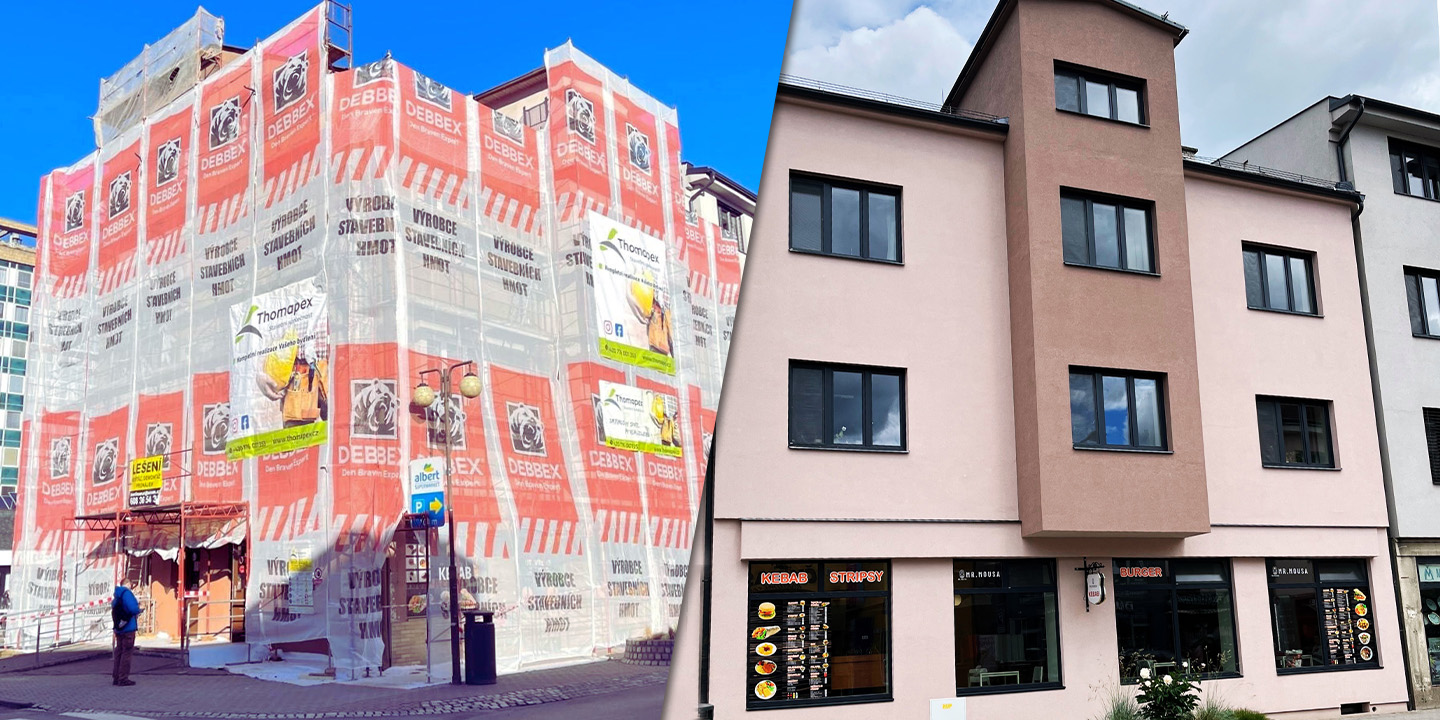 Základem celé rekonstrukce bylo odstranění původní fasády i obkladu v přízemí a sjednocení celého vzhledu domu. Výsledkem je čistá, elegantní fasáda v přírodních tlumených barvách, které mnohem lépe korespondují se zbytkem městské zástavby. Dům tak přestal působit výstředně a začal přirozeně zapadat do svého okolí. Ačkoli šlo o technickou rekonstrukci, výsledkem je změna, která zvýšila hodnotu nemovitosti a zlepšila celkový dojem z ulice. Přízemní část s obchodními prostory dnes nepůsobí uzavřeně ani těžkopádně, ale přirozeně navazuje na horní části domu. Zvolený systém tak neřešil jen energetické požadavky, ale i vizuální soudržnost celé stavby.