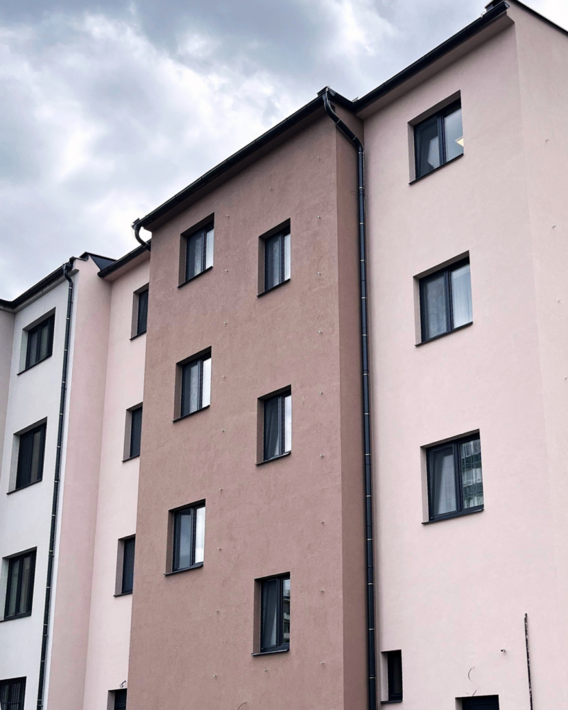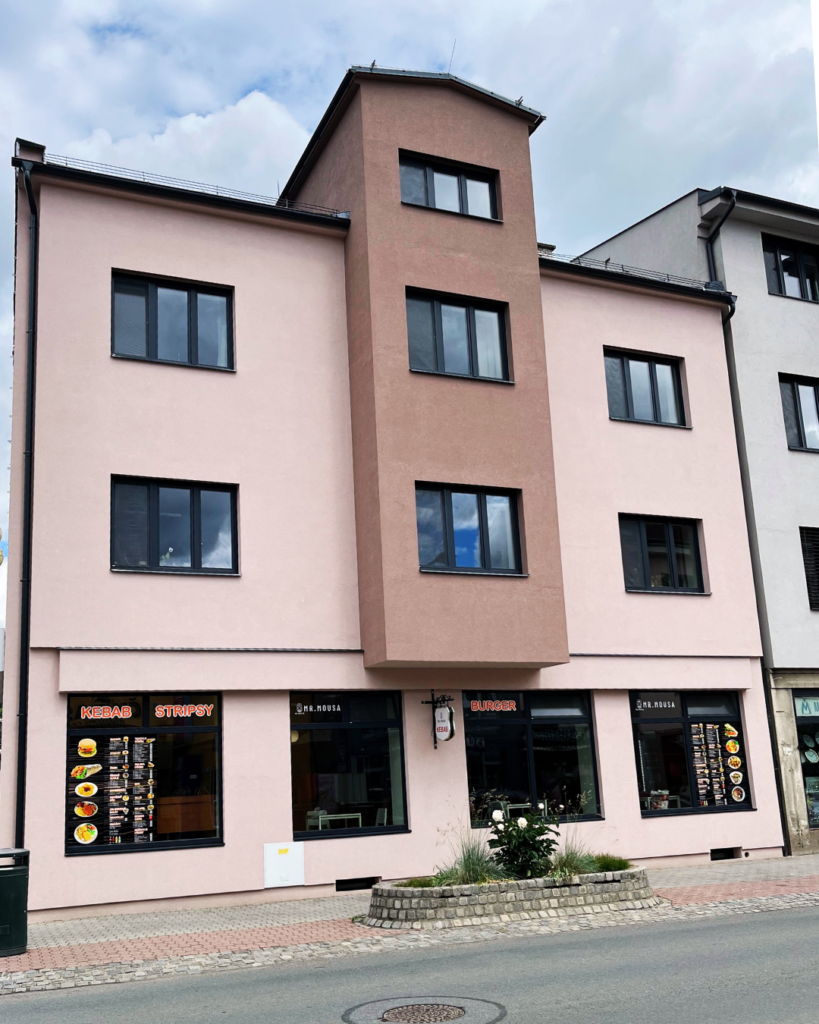Základem celé rekonstrukce bylo odstranění původní fasády i obkladu v přízemí a sjednocení celého vzhledu domu. Výsledkem je čistá, elegantní fasáda v přírodních tlumených barvách, které mnohem lépe korespondují se zbytkem městské zástavby. Dům tak přestal působit výstředně a začal přirozeně zapadat do svého okolí. Ačkoli šlo o technickou rekonstrukci, výsledkem je změna, která zvýšila hodnotu nemovitosti a zlepšila celkový dojem z ulice. Přízemní část s obchodními prostory dnes nepůsobí uzavřeně ani těžkopádně, ale přirozeně navazuje na horní části domu. Zvolený systém tak neřešil jen energetické požadavky, ale i vizuální soudržnost celé stavby.