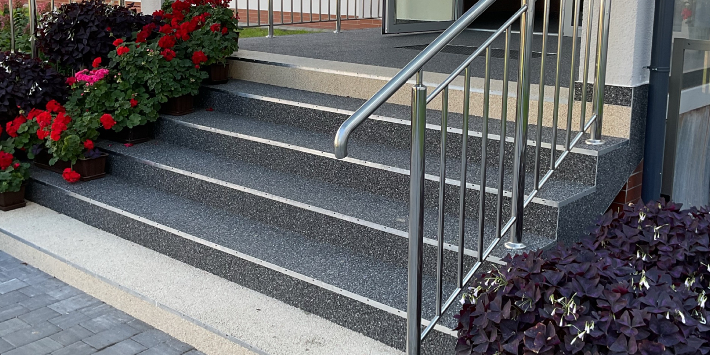 Zákazník zvolil kombinaci tří odstínů kameniva – černé, žluté a cihlově červené. Tento kontrast vytváří zajímavý, živý vzhled, který prostoru dodává hloubku a osobitost. Zároveň působí na schodech jako bezpečnostní prvek. Na stěnách byl použit mramorový koberec PerfectSTONE s pojivem WALL, které umožňuje aplikaci i na svislé plochy. Na hranách schodů byly přidány kovové lišty, které chrání exponovaná místa.
