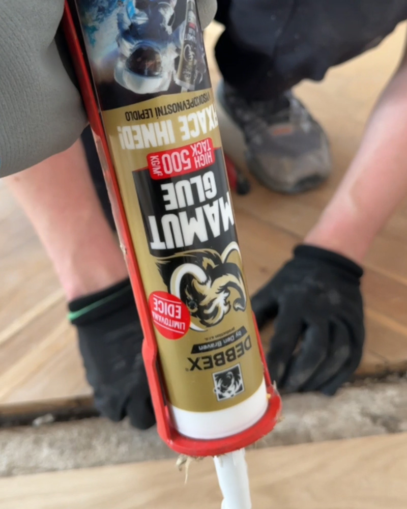 Po usazení podlahy přichází na řadu detaily, které dělají celkový dojem. Hlavní je přechod mezi původní rekonstruovanou podlahou a nově položenými parketami. Tady pomáhá MAMUT GLUE High Tack, známé vysokopevnostní montážní lepidlo s okamžitou fixací. Trvale pružný spoj s vysokou přídržností je pro podobné projekty ideální.