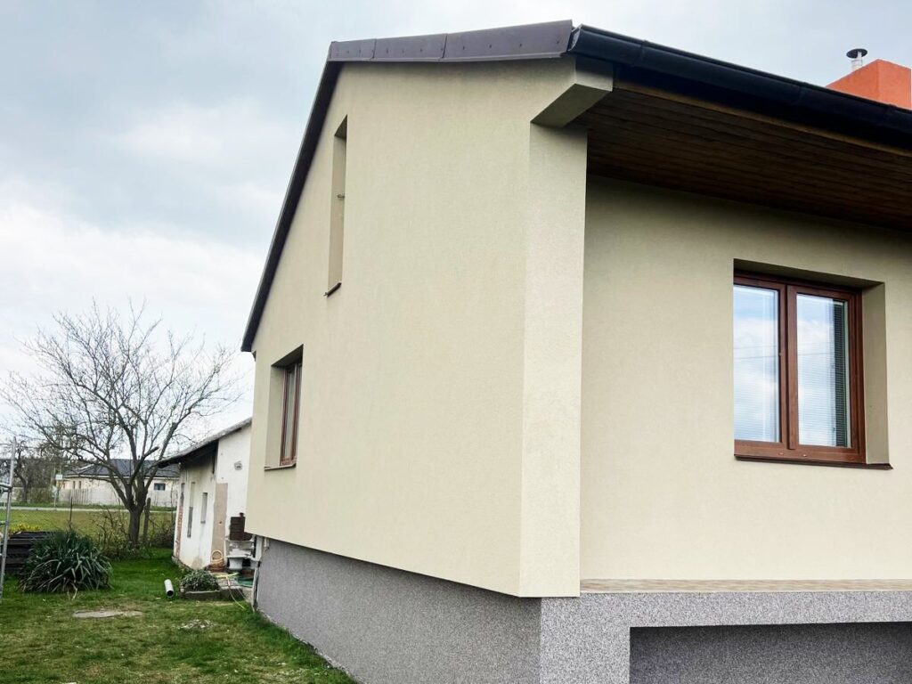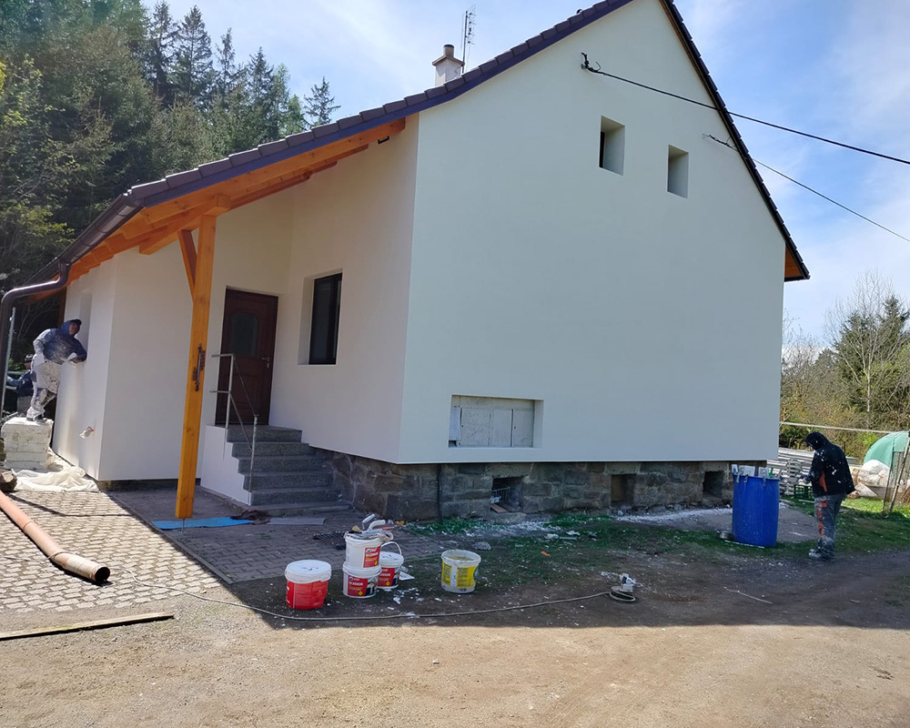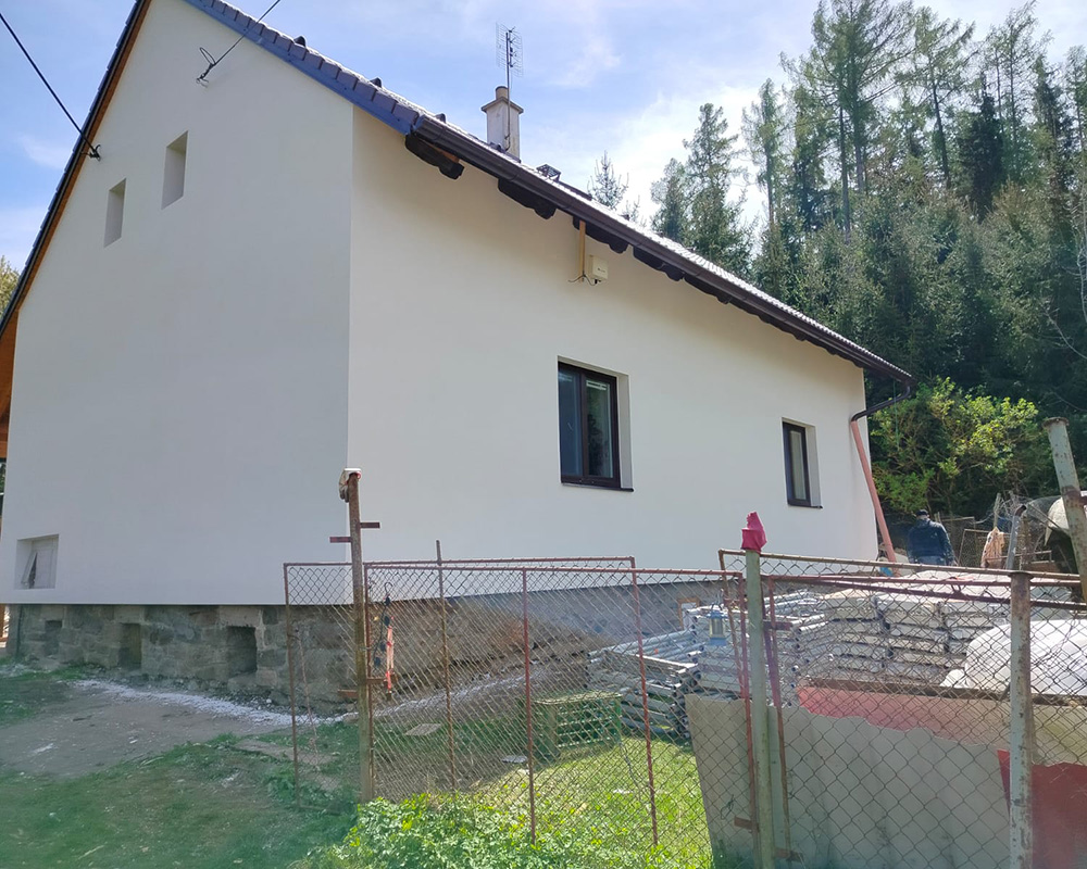 Vesnické stavení s kamennou podezdívkou prošlo kompletní obnovou včetně střechy a krovů, zateplení i výměny oken. Zazděné otvory po původních oknech byly zahlazeny tak, aby fasáda působila celistvě a přirozeně. Světlá barevnost navazuje na původní ráz domu, přesto mu dodává svěží a upravený vzhled. Výsledkem je harmonická kombinace tradičního charakteru a nového, moderního dojmu, díky které dům vypadá jako novostavba s duší.