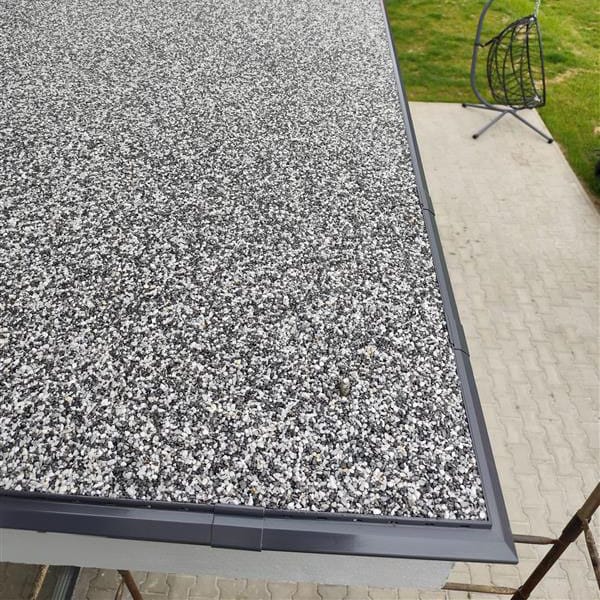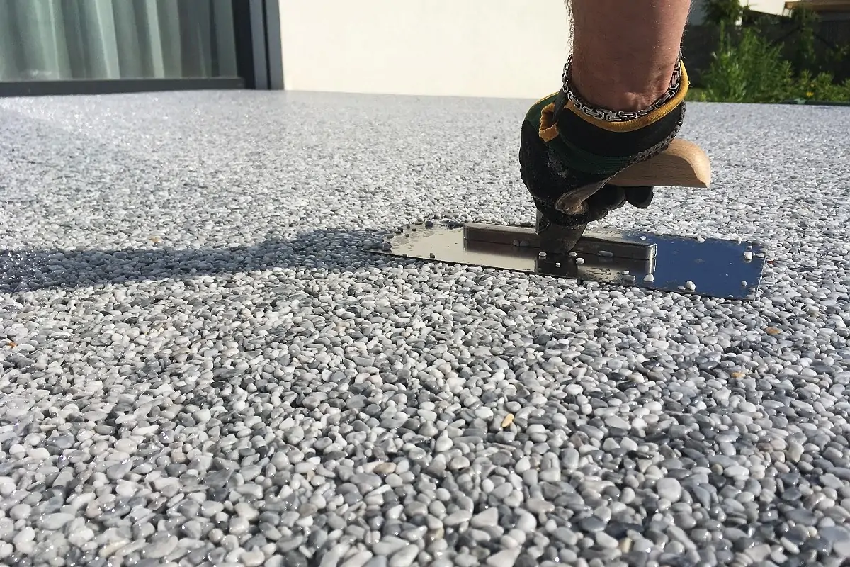 Multifunkční finální vrstva z říčních nebo mramorových kamenů spojených speciálními pojivy.